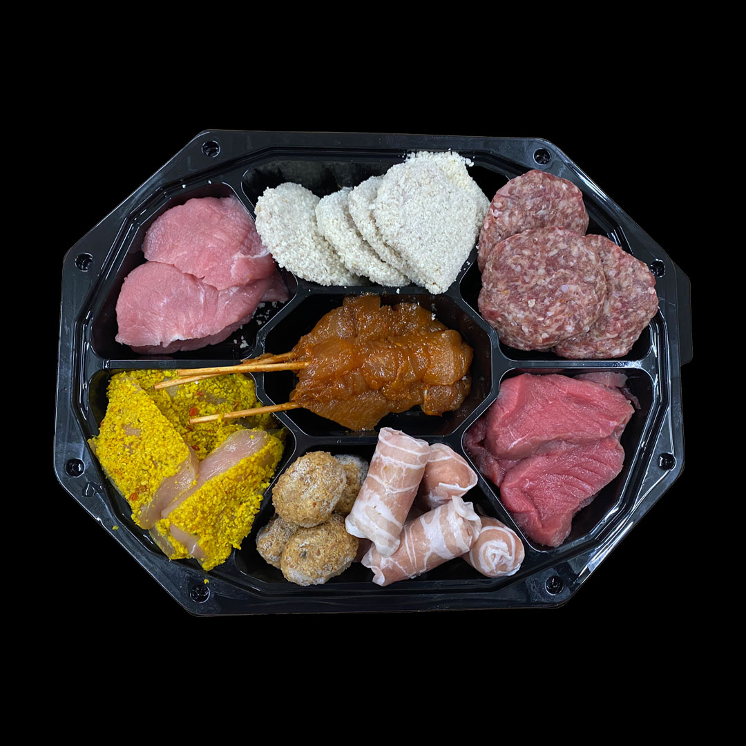 Onze eigen samengestelde gourmetschaal met 300 gram vlees per persoon. De schaal is samengesteld voor 4 personen en heeft 8 verschillende stuks vlees per persoon. €9,99 per persoon.